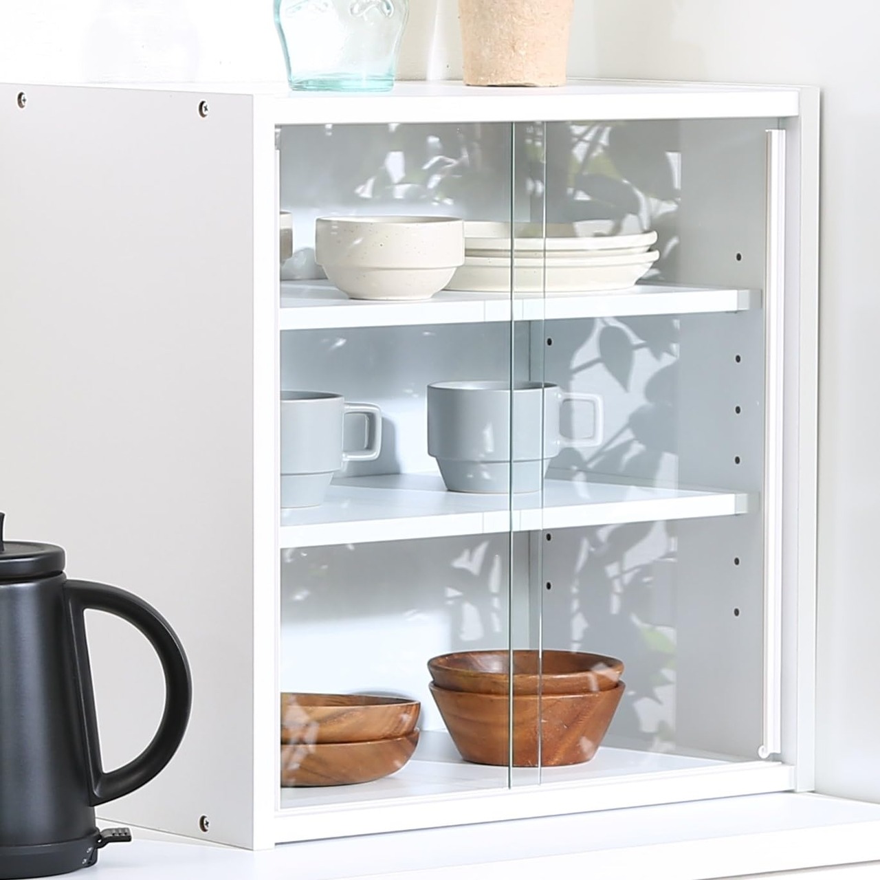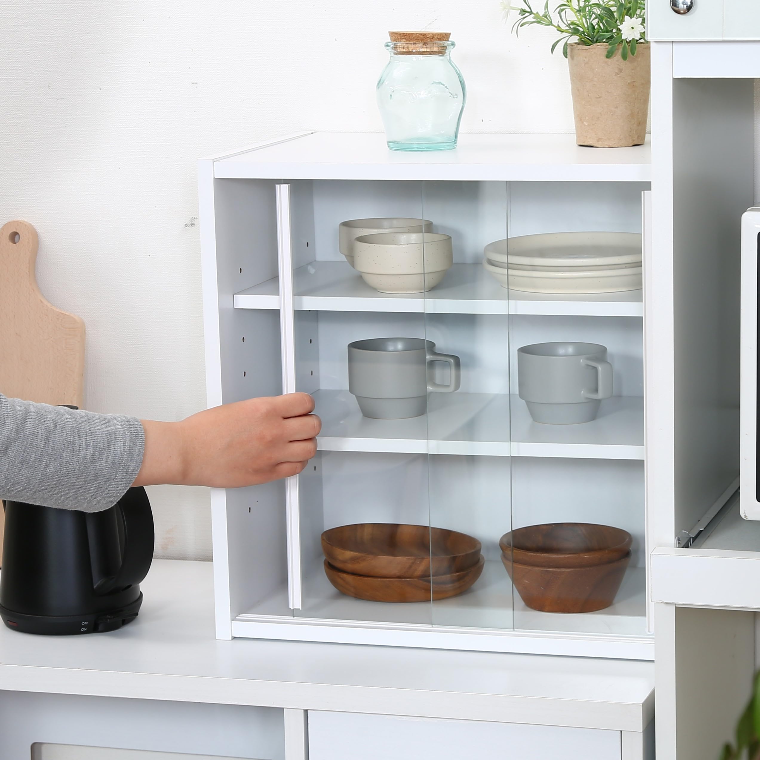 棚板は8段で調節できる可動棚で、平たいお皿から背の高いコップまでしっかり収納できます。