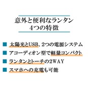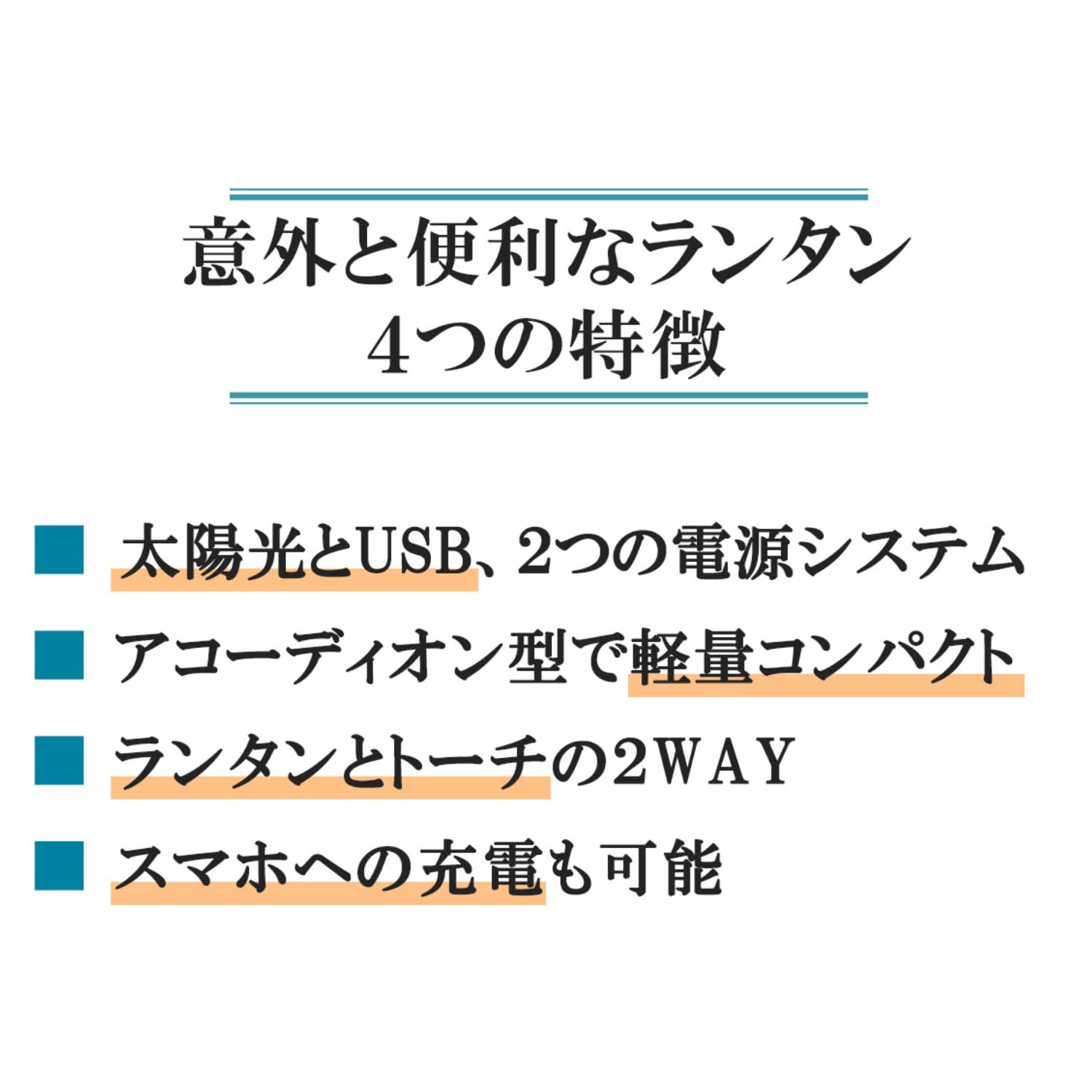 【「意外と便利なランタン」の5つの機能】1.USB充電とソーラー充電 2つの電源で安心 2.ランタンとトーチの2WAY 3.三段階調光(弱、強、点滅) 4.折りたたみ式なので軽量コンパクト 5.モバイルバッテリー機能付なのでスマホの充電が可能