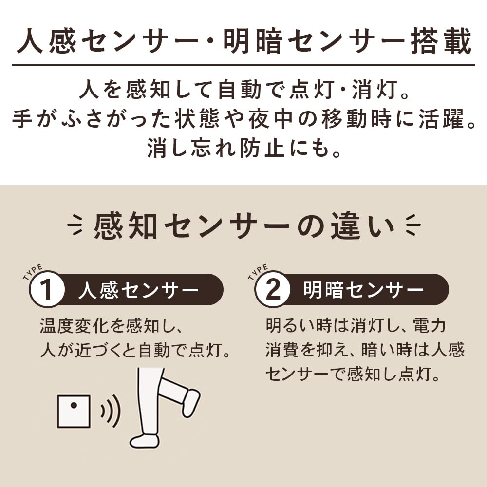 【こんなときにおすすめ】夜中移動時、電気をつけると目が覚めてしまう。/帰宅時、玄関の電気をつけるのが面倒。/就寝時、子供が暗闇を怖がってしまう。/ライトを設置したいけど、配線が難しい。