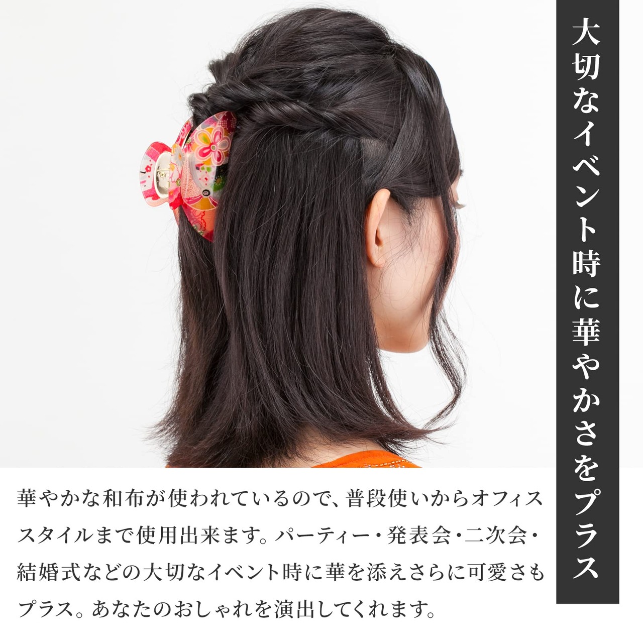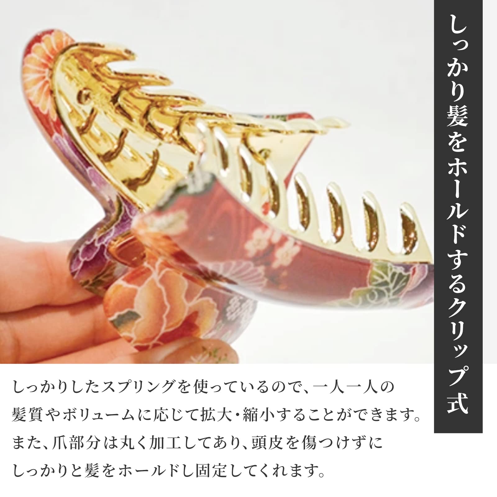 シンプルですが大きめサイズで、華やかで品の良い和柄デザインが目を引きます。 どんな装いにも合わせられるので、髪をさっとまとめたい時の普段使いにはもちろん、パーティーなどのヘアアレンジにもお使いいただけます。 まとめた髪を挟むだけで簡単に髪がまとめられますので、一つ持っておけば、役立ちます。 女性への贈り物としても最適です。 和風モチーフになっており、海外の女性にも人気の商品です。