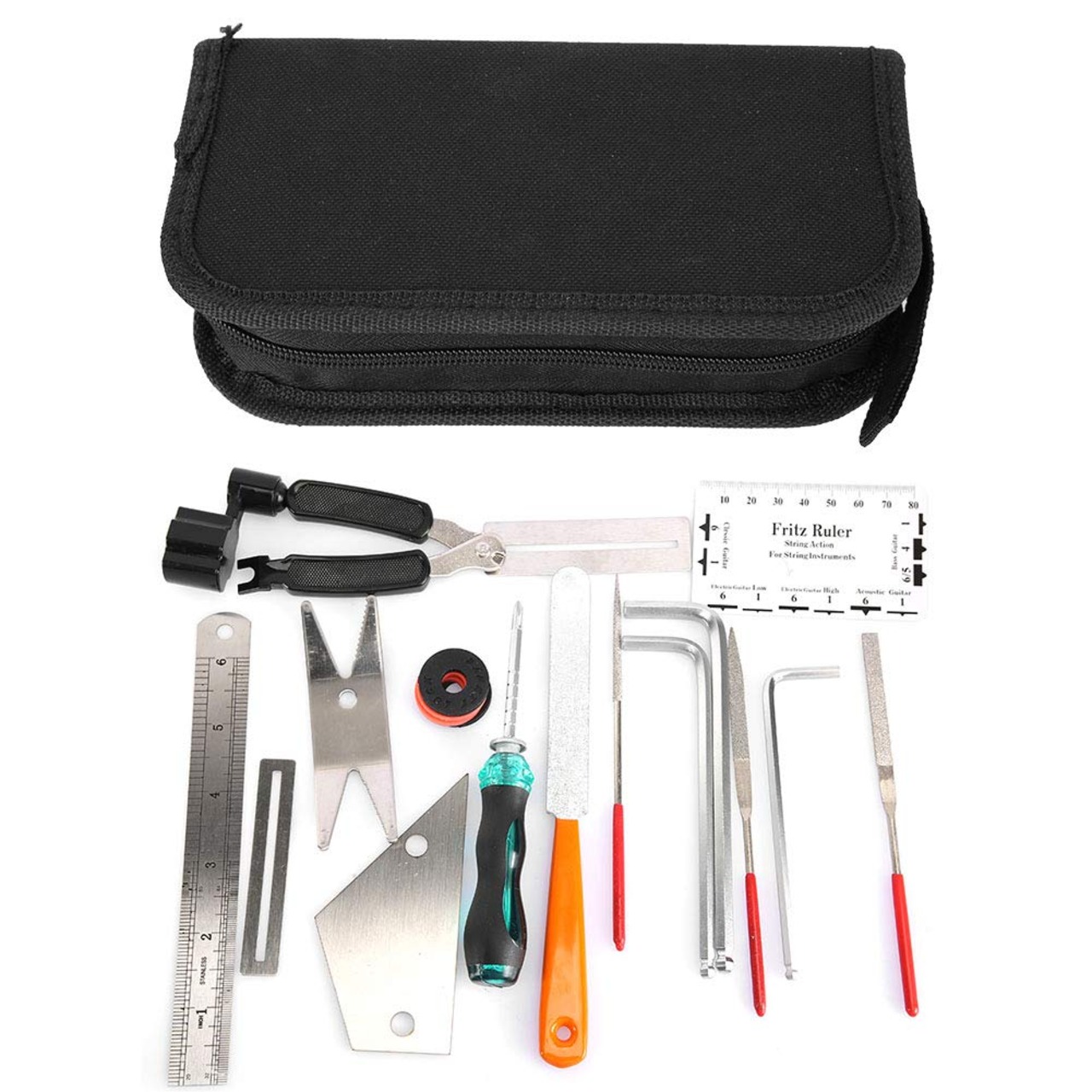 パッケージに含まれるもの:1 x 3 in 1ストリングワインダー、3 x六角レンチ、1 x穴付きオレンジファイル、3 xサンディングファイル、1 xドライバー、4 xガスケット、1 xステンレススチールルーラー、1 xストリングアクションルーラー、2 xフレット定規、1 x台形定規、1 x保存袋。