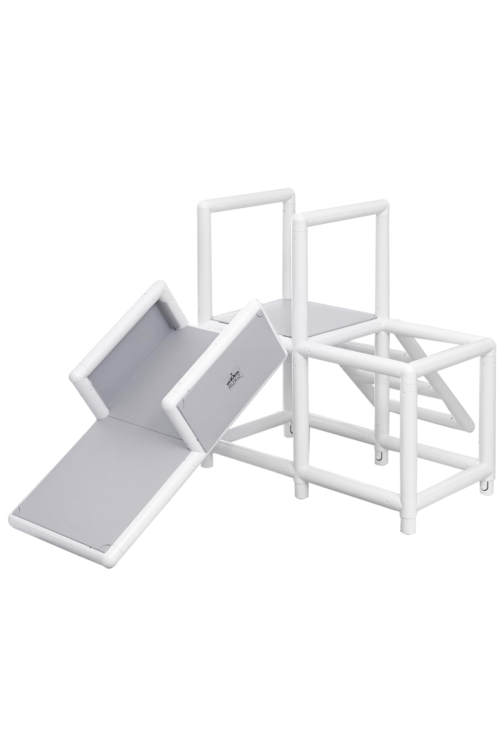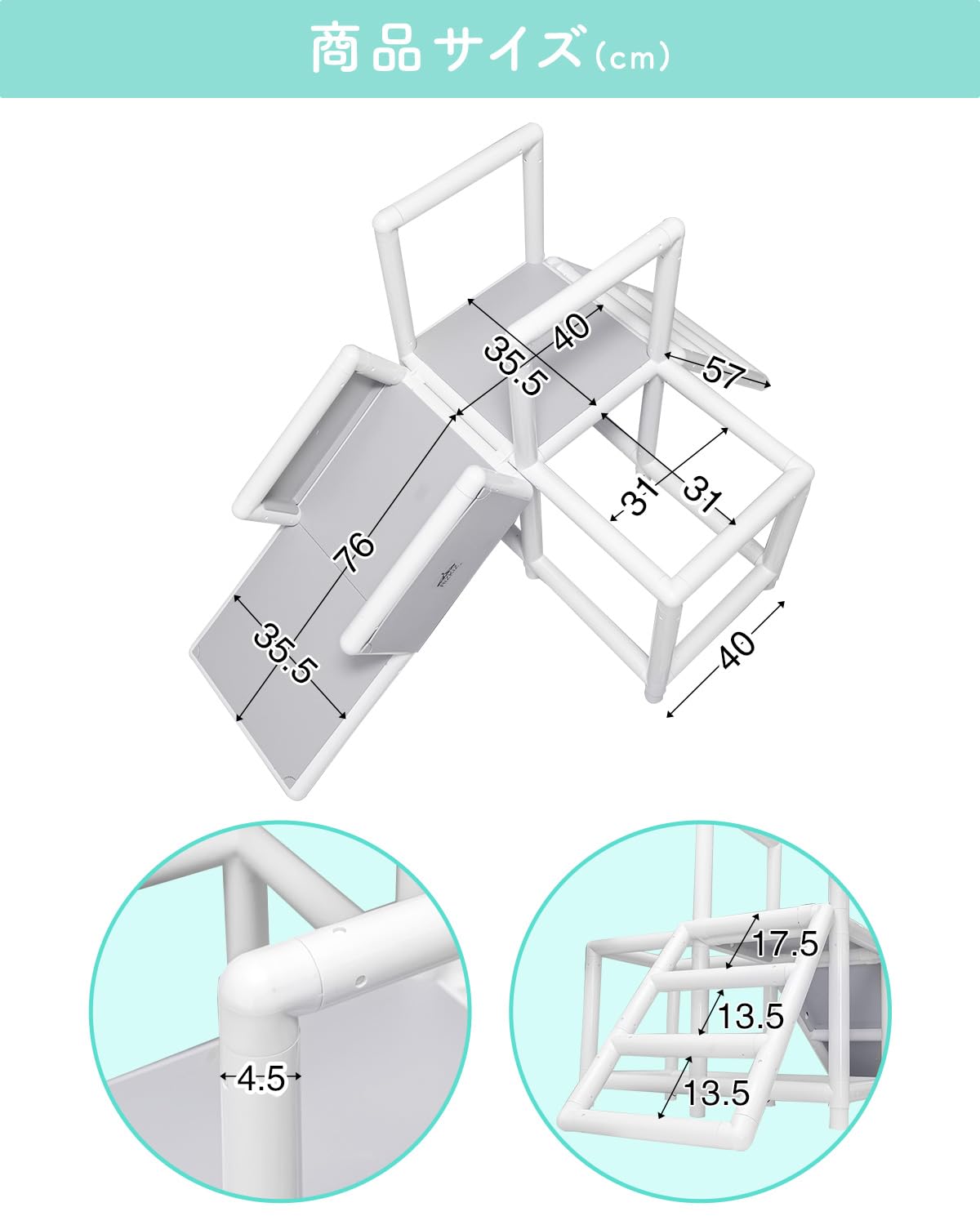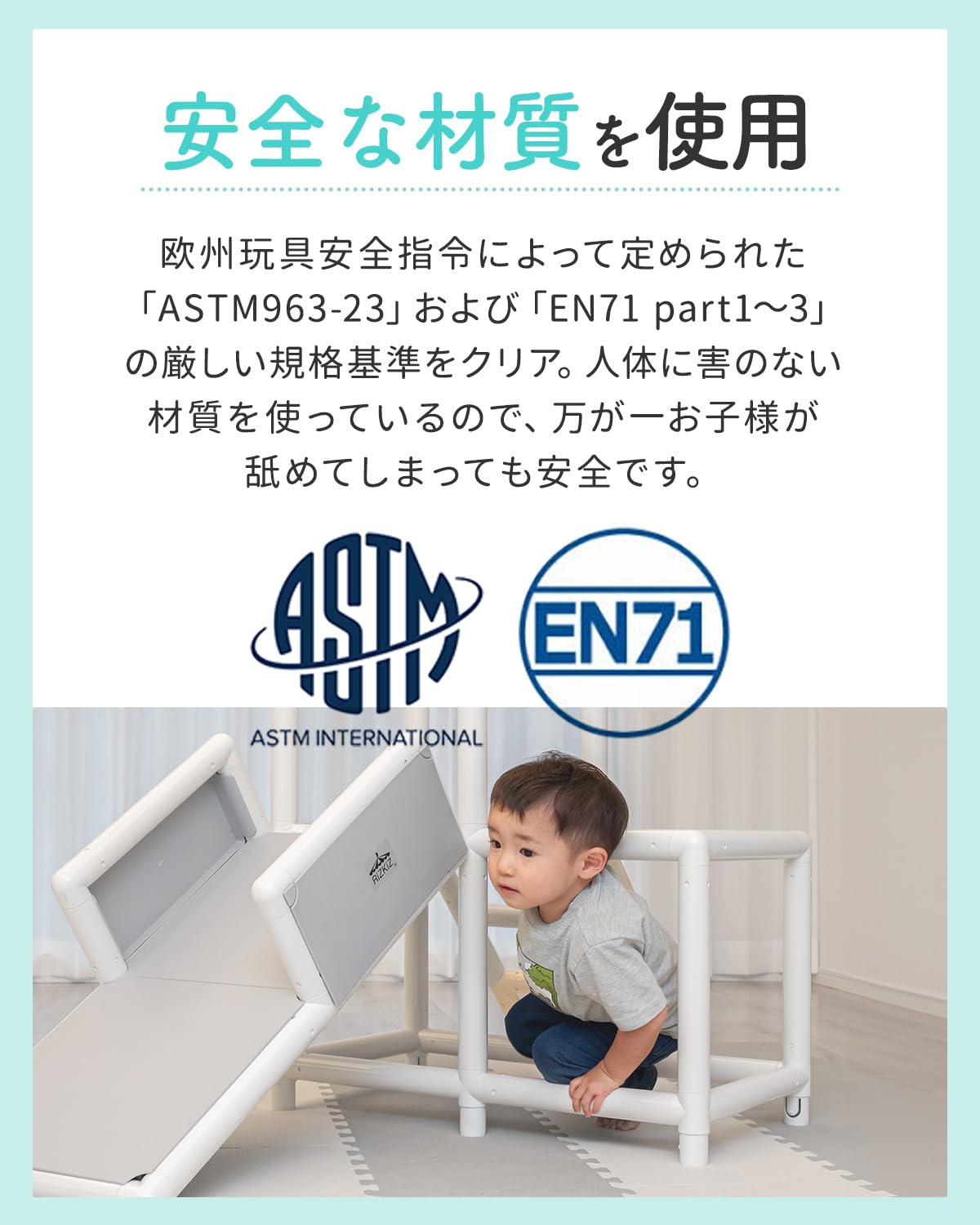 【現役ママのお墨付き!】組み換え可能なジャングルジム。雨の日でもお家の中ですべり台が楽しめる!雨の日や熱中症が心配な夏や寒い冬でもおウチの中で身体を動かしストレス発散!公園に行けない日でも室内で快適に運動ができ、お子様もママパパも安心です◎【成長に合わせて自由に組み替え!】組み方によって全く違う形に変えられる室内遊具です。滑り台付きのジャングルジムはもちろん、遊ばなくなった後は子供部屋のシェルフやステップに組み替えたりと、成長に合わせ長く使えます。【小さなお子さまでも安心安全!】安全に遊べるよう、登ってもグラつかない頑丈なジャングルジムです。握りやすい手すりや挟みにくいパーツ設計など、安全面に配慮しています。【ヨーロッパの厳しい安全基準に適合】欧州玩具安全指令によって定められた「ASTM F963」および「EN71-3:2013」の厳しい規格基準をクリア。万一お子様が舐めてしまっても安全です。【狭い部屋にも置けるコンパクトサイズ】2段で高さ約80cm、1歳から遊べるコンパクト設計。パーツが多すぎず全てのパーツを使用しても省スペースに設置できます。