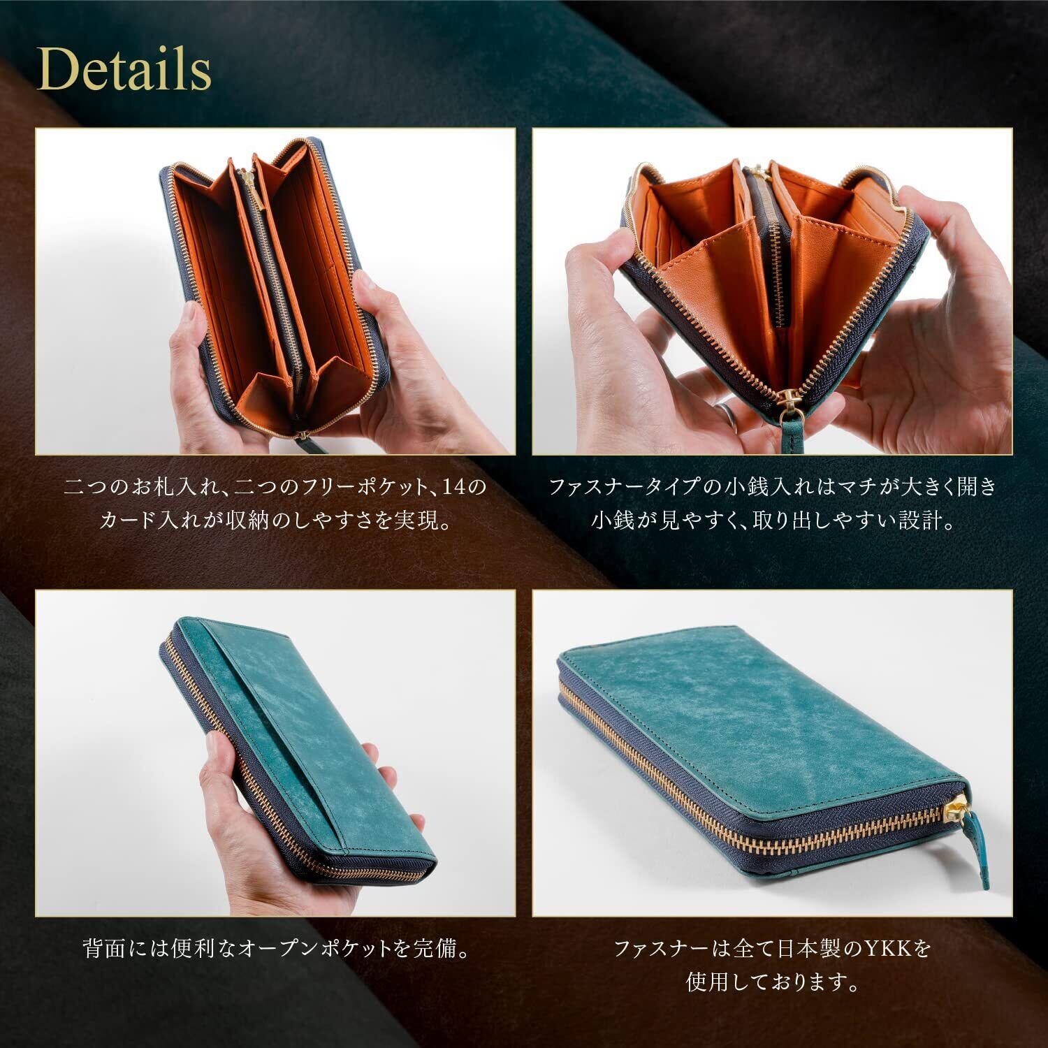 【機能的なデザイン】YKKファスナーを採用し、滑らかな開閉が可能です。内部にはカードポケットやお札入れ、コインポケットが配置されており、収納力も抜群です。日常使いに最適なサイズ感で、ビジネスシーンでも活躍します。