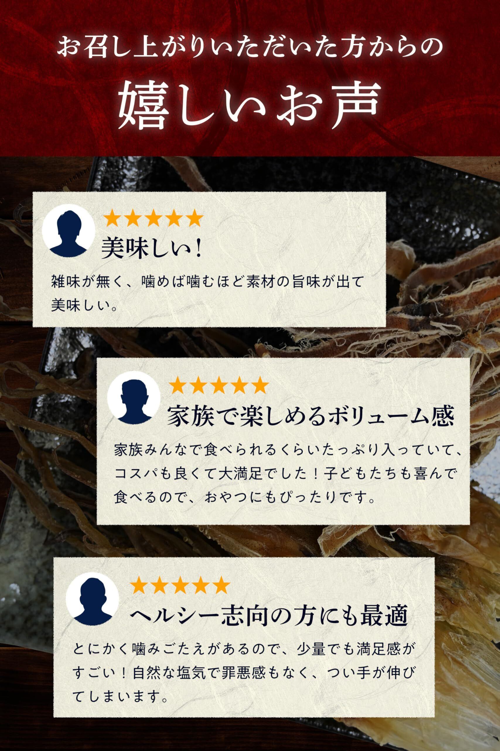 【安心・安全な製品】国産のスルメイカを使用し、添加物を一切使用していないため、安心してお召し上がりいただけます。品質にこだわりぬいた商品で、大人から子供まで幅広い方にお楽しみいただけます。