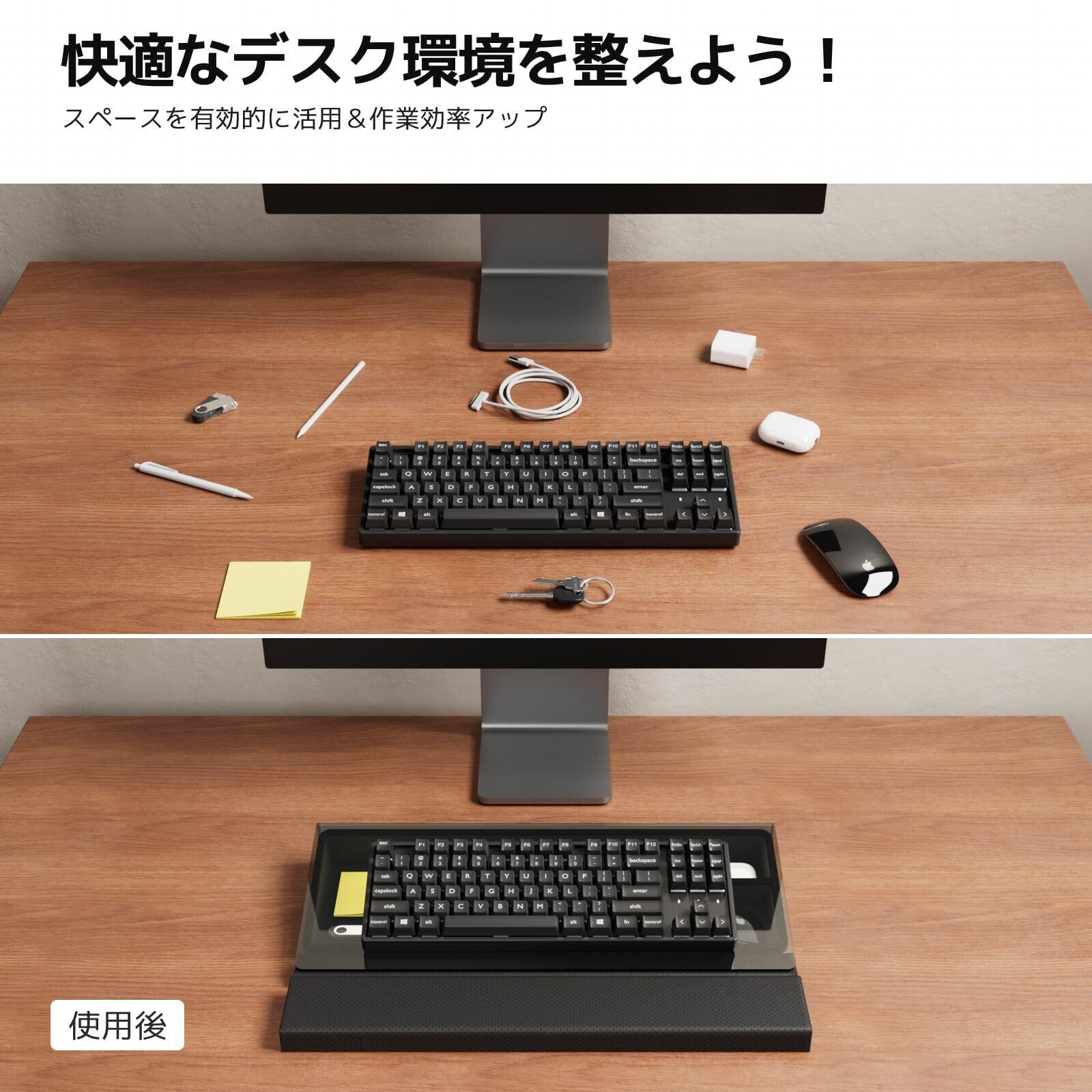【デスクをより広く使える】収納トレイには、キーボードやマウスをすっきりと整理できます。スペースを有効に活用できるため、デスク周りがすっきりし、集中力もUP!仕事や趣味を楽しむ時間をより充実させます。