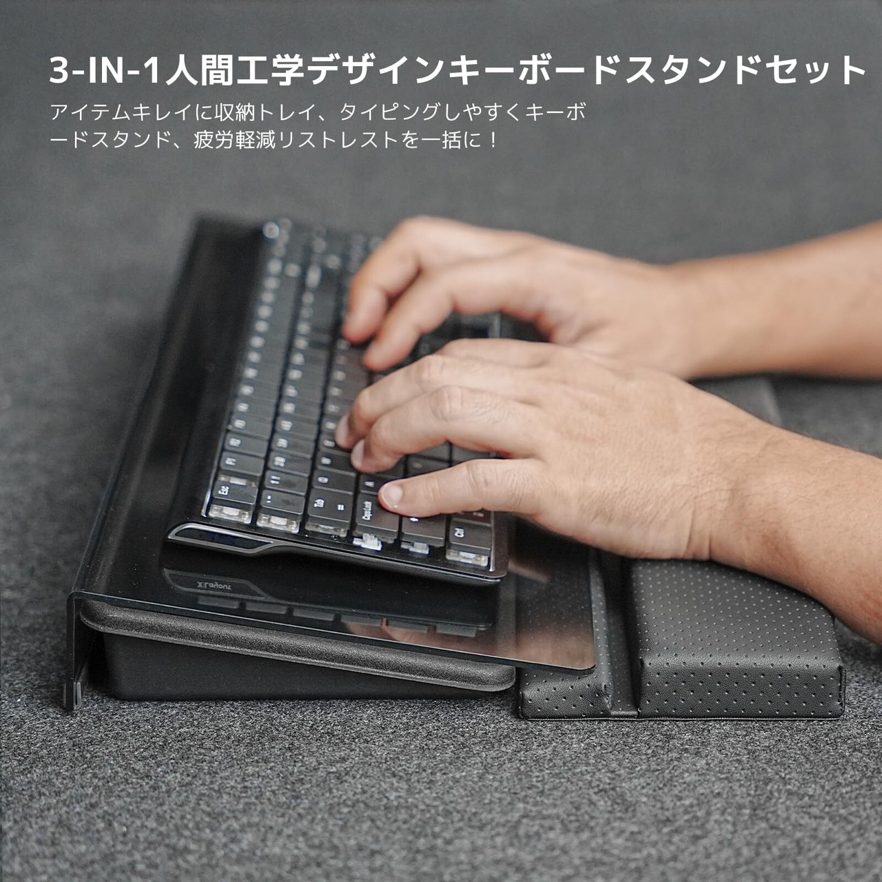 ⌨【3段階高さ調整・快適な作業環境】:人間工学に基づいたデザインで、キーボードの位置や角度を自分に合った角度・高さに調整でき、タイピングがしやすくなります。それに、セット内のリストレストと収納トレイを合わせて使用すると、腕と肩に疲労を軽減でき、デスク周りをすっきり収納できます。より快適な作業環境を作りましょう。