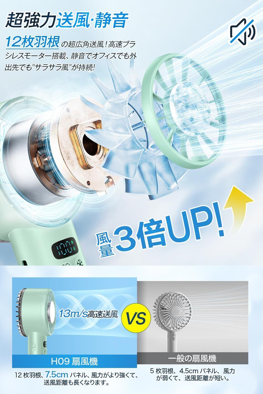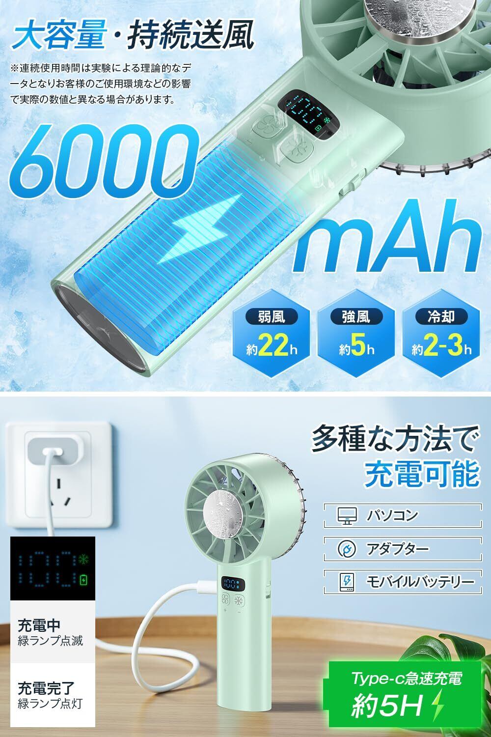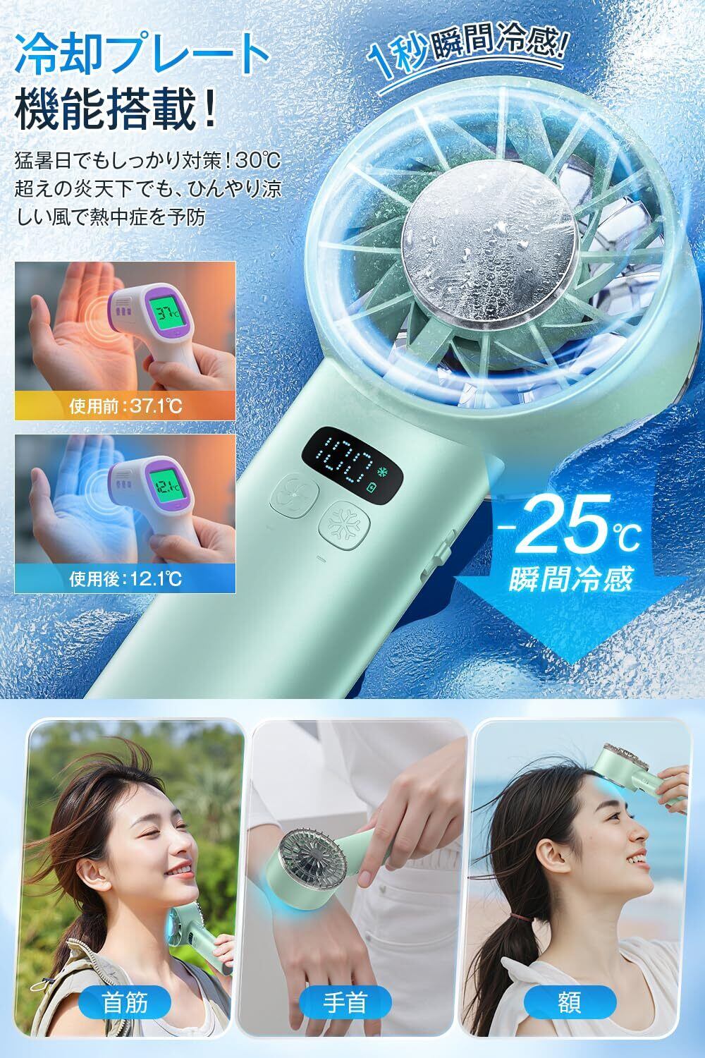 【2022最新】携帯扇風機 ハンディファン 【2025年モデル & -25℃瞬間冷却】 冷感プレート 手持ち扇風機 ミニファン 12枚羽根 6000mAh大容量 軽量 強力 静音 1~100無階段風量 USB-C充電式 卓上扇風機 小型 ポータブル 冷却 ストラップ付き LEDディスプレイ 熱中症対策 アウトドア/スポーツ観戦/オフィス/夏祭りなどに適用 ギフト (グリーン)