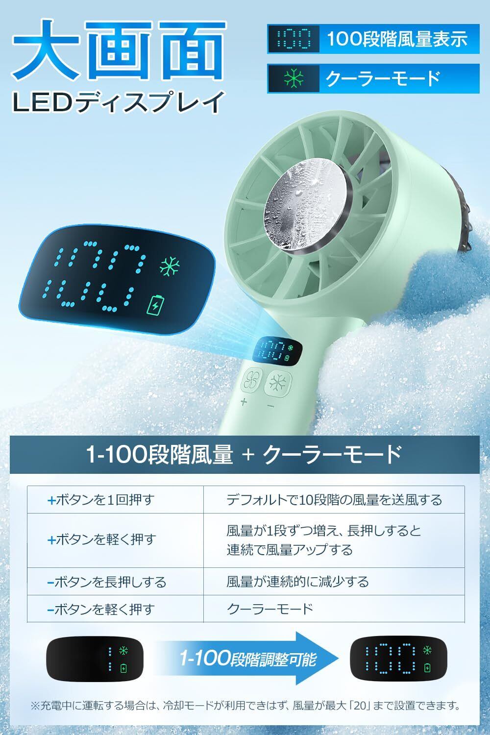 【風量無段階調節&12枚羽根構造ハンディクーラー】風量は1〜100まで細かく調整可能。電源を入れて+ボタンを押すと、初期設定で10の風量からスタートします。+ボタンを短く押すたびに風量が1段階アップ、長押しでスムーズに連続調整可能。−ボタンで逆方向にも対応。さらに、12枚羽根の高性能設計により、一般的な携帯扇風機よりも強力な送風を実現しています。