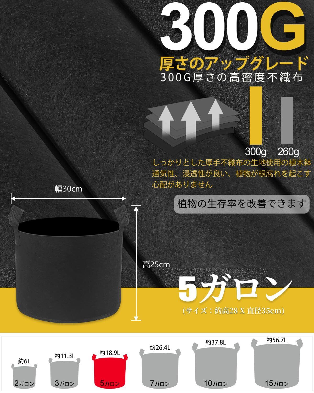 【家庭菜園に最適!】この不織布プランターは、5ガロンサイズ(直径30cm × 高さ25cm)で、様々な植物や野菜の栽培にぴったりです。通気性が良く、根の成長を促進し、健康な植物育成をサポートします。