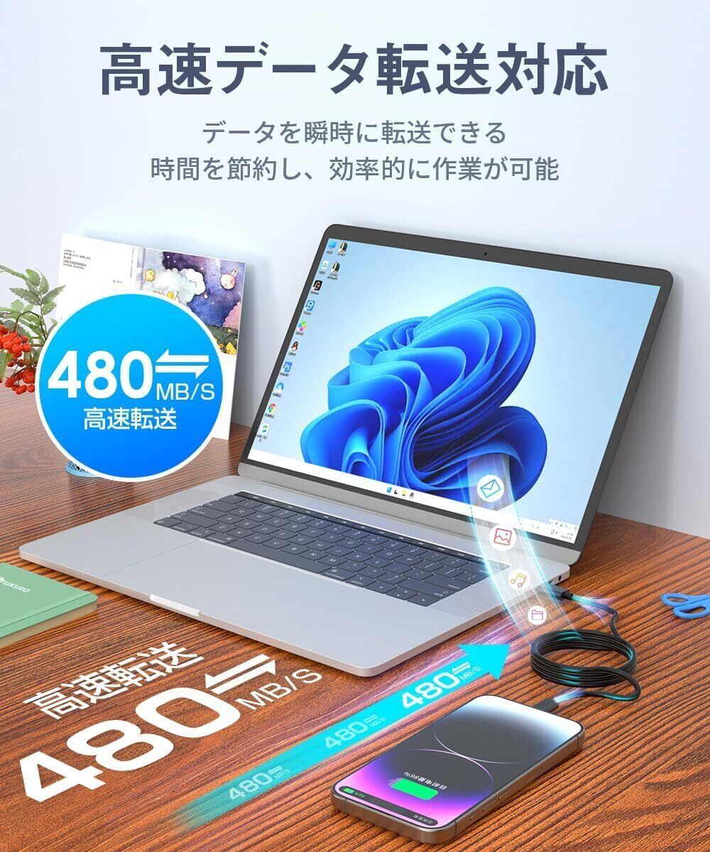 【急速充電対応】このUSB Type-Cケーブルは、最大60Wの急速充電に対応しており、短時間でデバイスを充電できます。忙しい日常の中でも、サッと充電できる利便性を提供します。