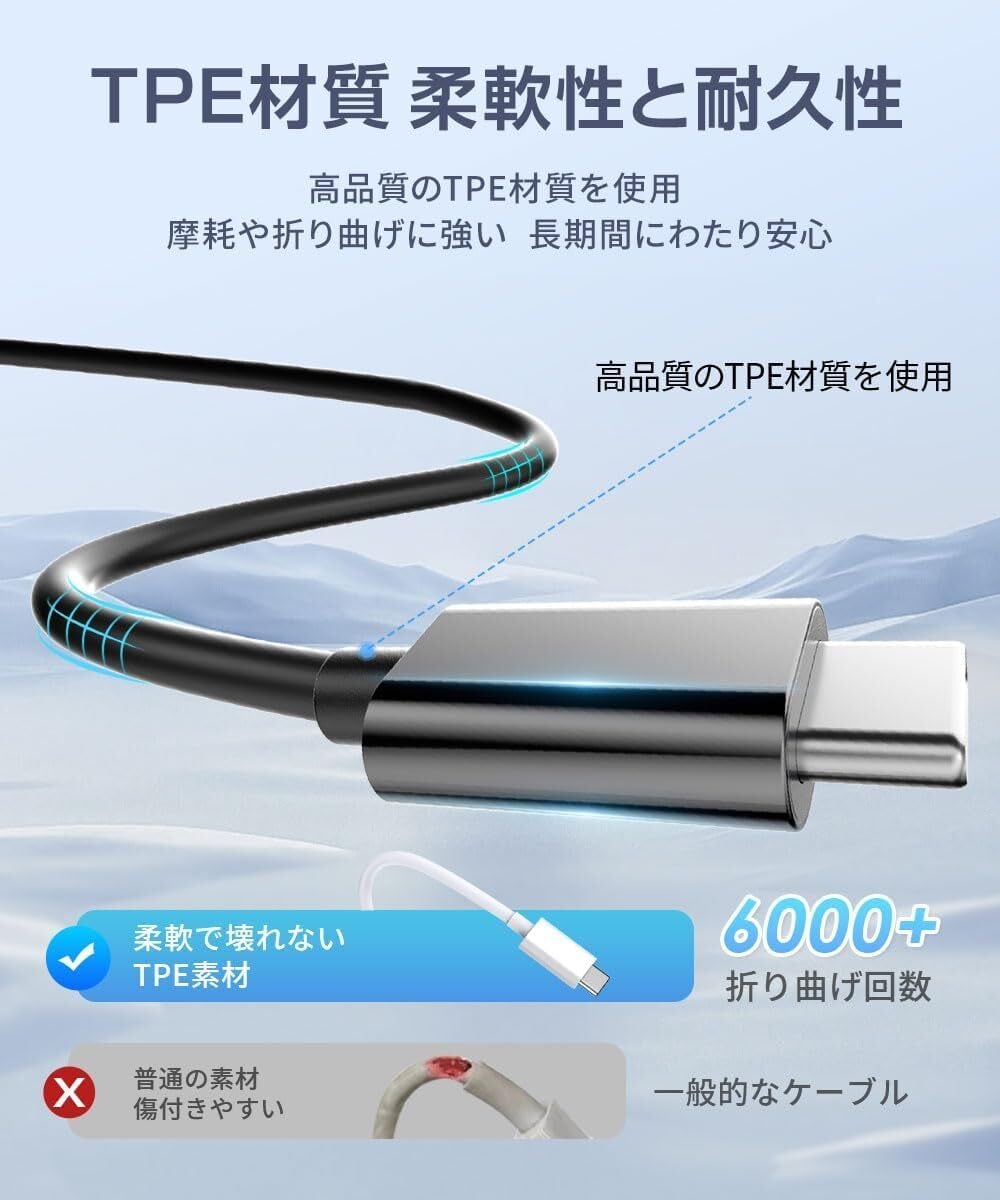 【高耐久設計・断線防止】 高耐久 usb ケーブル として、素材と構造にこだわった断線防止設計を採用。usb c ケーブル 高耐久なので繰り返しの折り曲げや持ち運びにも強く、長期間安心して使用できるtype c 充電コードです。