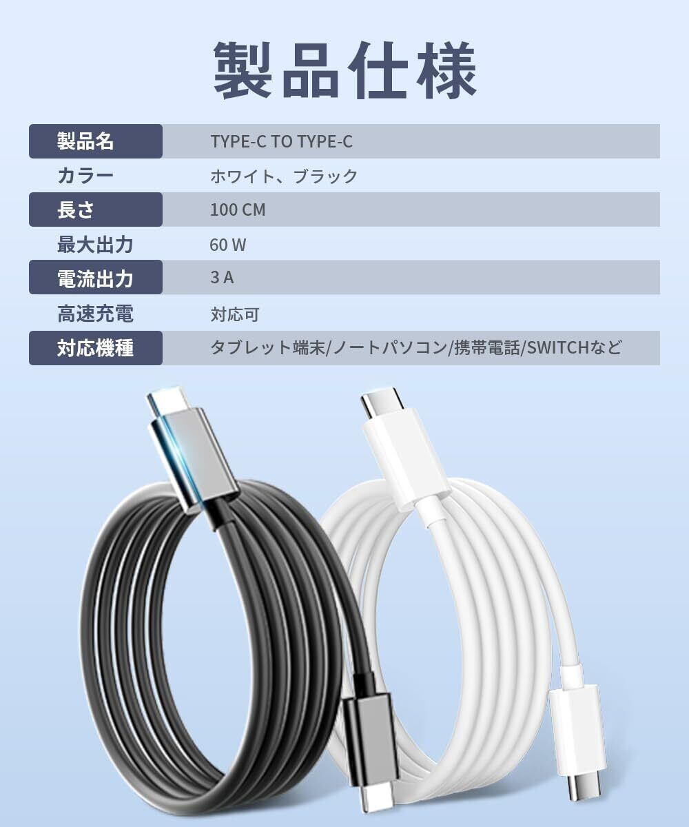 USB Type-c ケーブル 60W PD対応 急速充電 両端タイプC ケーブル usb c cable 1M USB データ転送 3A 充電コード 断線防止 高耐久性 映像出力不可 iPhone 16 / 15 / MacBook Pro/iPad/Galaxy/Sony/Pixel など Type C 機種対応