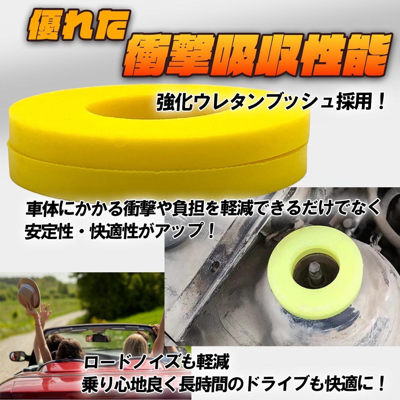 強化ウレタンブッシュを採用しているので、車体にかかる衝撃や負担を軽減できるだけでなく、安定性、快適性がアップしてロードノイズも軽減され、乗り心地も良くなるので、長時間のドライブも快適になります。